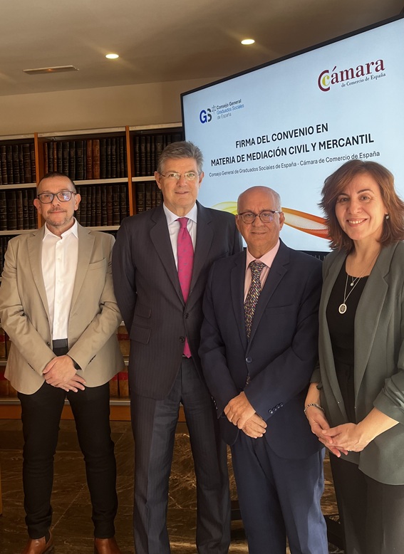 En el acto de firma del convenio, celebrado en la sede de la Cámara de España, han participado Rafael Catalá, presidente del Centro Español de Mediación (CEM). Por parte del CGGSE, han intervenido su presidente, Joaquín Merchán Bermejo, y Francisco José López Díez y María José García Pedreño, coordinador y miembro de la Comisión Técnica de Mediación, respectivamente.