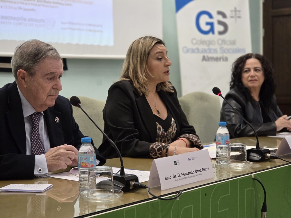El acto de apertura ha estado presidido por la Diputada de Recursos Humanos y Contratación de la Excma. Diputación Provincial de Almería, Dª María del Mar López Asensio, por la Presidenta del Ilustre Colegio Oficial de Graduados Sociales de Almería, Dª María del Mar Ayala Andújar y el Ilmo. Sr. D. Fernando Brea Serra, Fiscal, Profesor Tutor de la UNED y Colegiado de Honor de este Colegio Oficial.