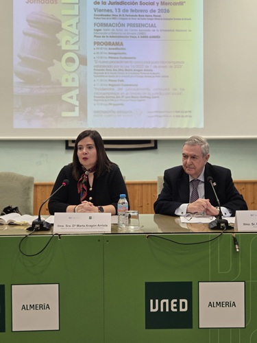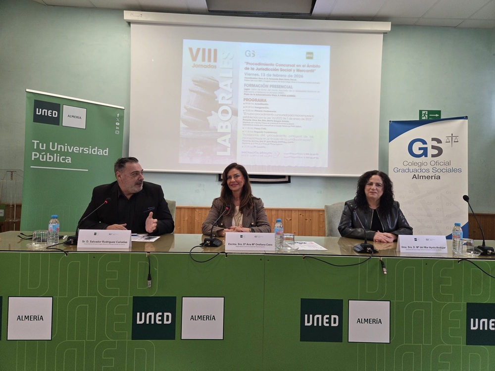 Almería, 13 de febrero 2026.- Durante la jornada de hoy, este Colegio de Graduados Sociales y el Centro Asociado de la UNED, organizaron conjuntamente las VIII Jornadas Laborales, en el salón de actos del Centro Asociado de la UNED, donde se han dado cita un nutrido grupo de profesionales interesados en la materia, sobre “Procedimiento Concursal en el Ámbito de la Jurisdicción Social y Mercantil”